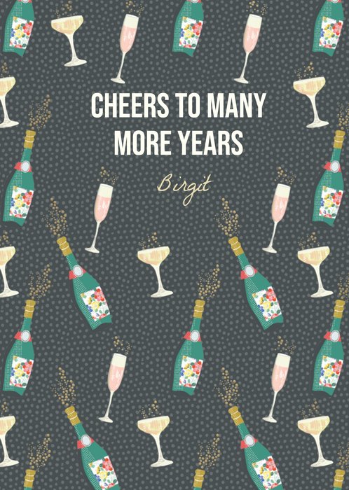 Feliciteer iemand met deze kaart waarop de tekst "cheers to many more years" staat. Op de kaart staan verschillende glazen en champagne flessen.
