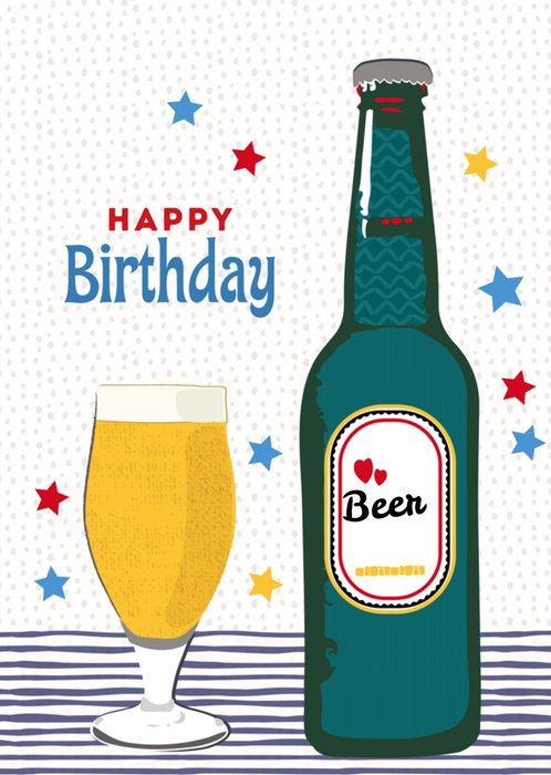 Feliciteer iemand met deze leuke kaart. Op de kaart staat een bierfles en de tekst "happy birthday"