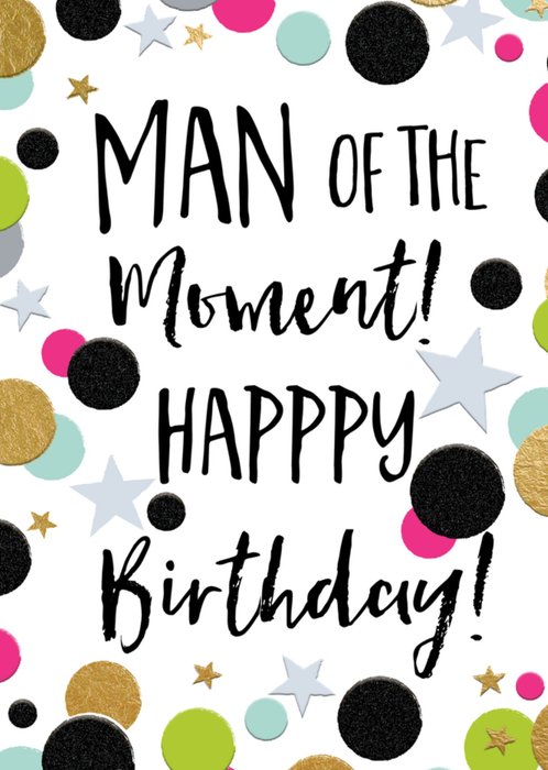 Op deze kaart van TMS zie je de tekst: Man of te moment! Happy Birthday. Om de tekst heen zie je allemaal stippen en sterren.