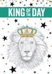 Op deze verjaardagskaart zie je een leeuw met een kroon op. Om de leeuw heen zie je allemaal sterren. Bovenaan de kaart staat de tekst: king of the day.