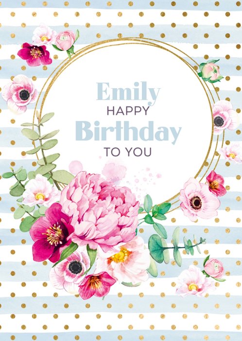 Feliciteer de jarige met dit vrolijke verjaardagskaartje. Op de kaart staan bloemen met daarbij de tekst: "Happy birthday to you." De naam op de kaart is aanpasbaar.