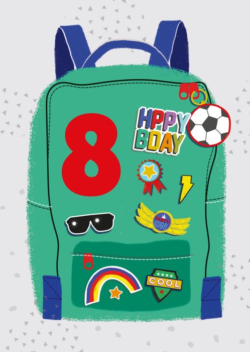 Leuke verjaardagskaart om iemand die acht jaar oud wordt mee te verrassen. Op de kaart zie je een groene rugak met allemaal stickers erop en de tekst: Hppy bday.