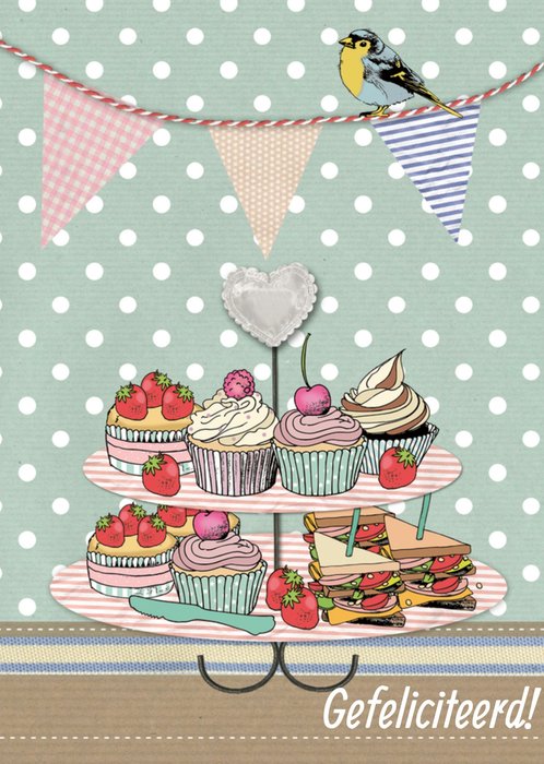 Partytime! Jij kent iemand die binnenkort jarig is! Feliciteer dan met een super leuke verjaardagskaart van TMS. Op deze kaart zie je lekkere taartjes en de tekst: Gefeliciteerd!