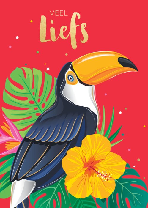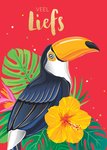 Een vrolijke kaart om zomaar "veel liefs" te sturen. Op de kaart is een Toekan afgebeeld.