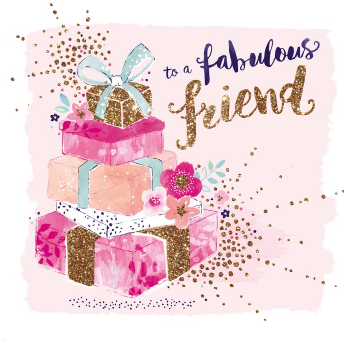 Op deze vrolijke, vrouwelijke Hotchpotch Rose verjaardagskaart zie je een grote stappel met cadeaus en de tekst: to a fabulous friend.