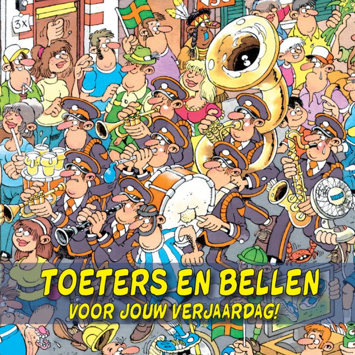 Een leuke kaart van Jan van Haasteren met de tekst 'Toeters en bellen voor jouw verjaardag!'.