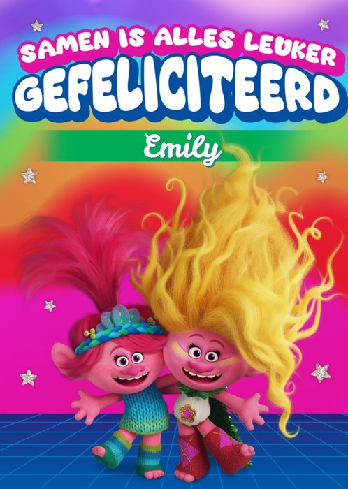 Kleurrijke verjaardagskaart van Universal met Trolls.