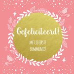 Een leuke roze kaart met in het midden en gouden cirkel en daaromheen duiven en bladeren en met de tekst: Gefeliciteerd met je eerste communie!