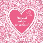 Een leuke roze kaart met in het midden een hart en daaromheen getekende bloementjes en hartjes. .
