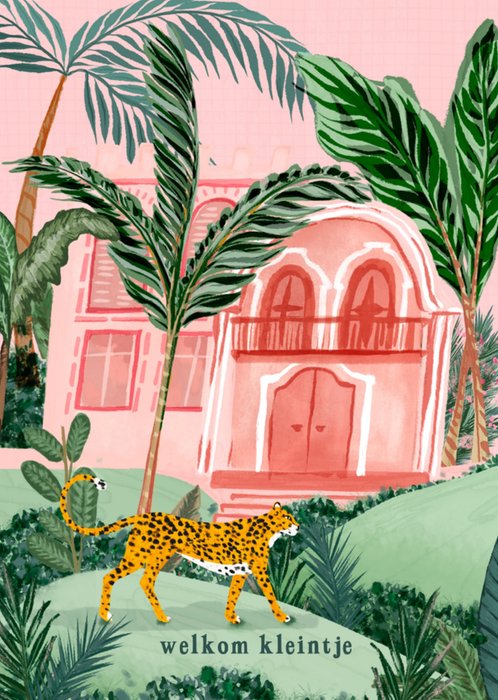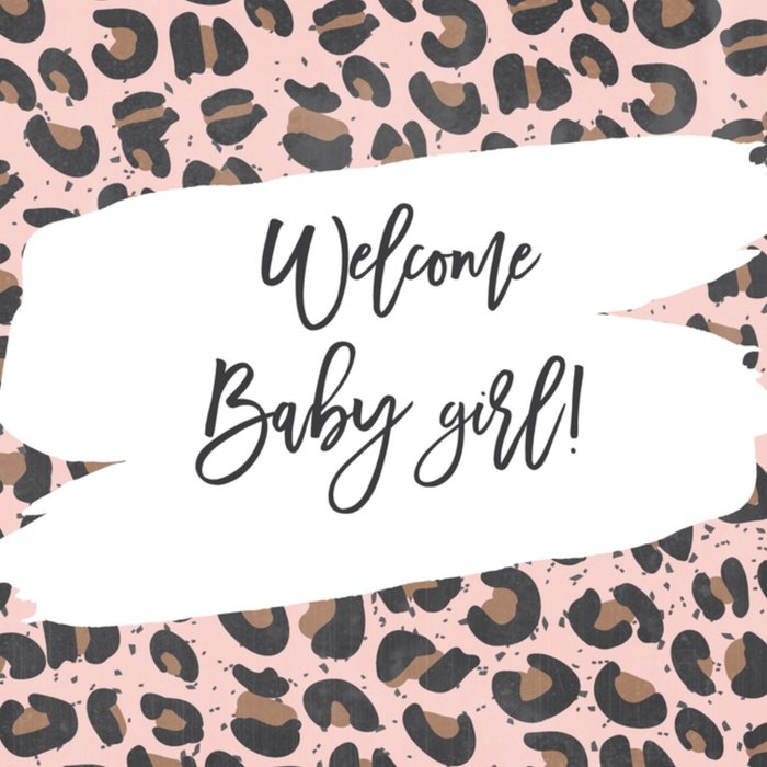 Feliciteer de kersverse ouders met de komst van hun kleine meid met deze hippe geboortekaart met tijgerprint en de tekst: "Welcome baby girl!"