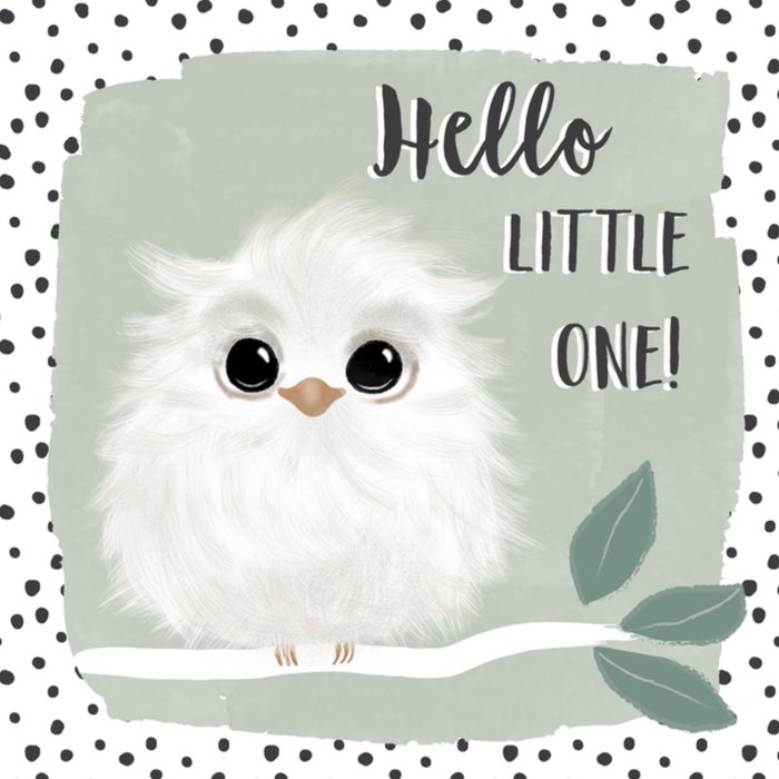 Een kleintje geboren? Feliciteer de kersverse ouders met dit prille geluk. Je ziet een uiltje op een tak, met de tekst: Hello little one! De achtergrond is olijfgroen.