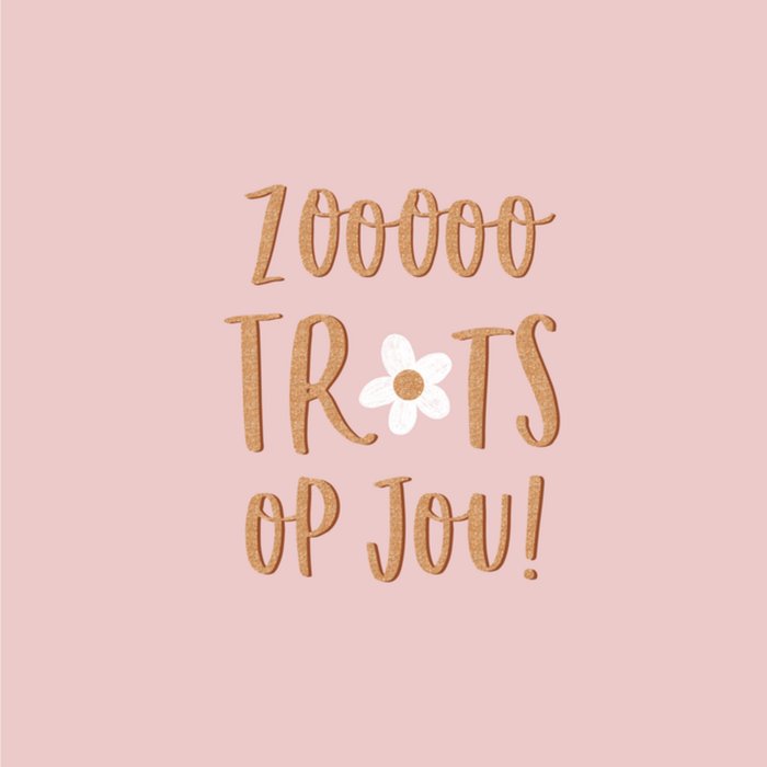 Typografische geslaagdkaart met een roze achtergrond en de gouden tekst: 'Zooooo trots op jou!'. Laat iemand weten dat je trots op haar bent met deze kleurrijke geslaagdkaart van Tsjip.