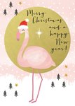 Kerstkaart met een roze flamingo die een kerstmuts op heeft. Naast de flamingo zie je een in goude cirkel de tekst: merry christmas and a happy new year.