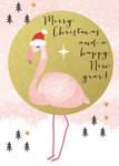 Kerstkaart met een roze flamingo die een kerstmuts op heeft. Naast de flamingo zie je een in goude cirkel de tekst: merry christmas and a happy new year.