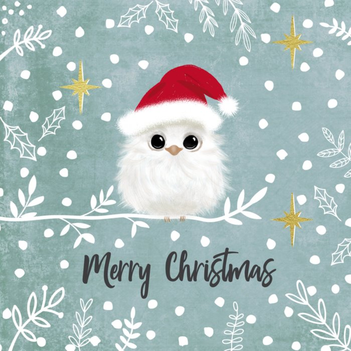 Een super schattig kerstkaartje met een kerstuiltje in de sneeuw. Onder het uiltje staat de tekst: 'Merry Christmas.'