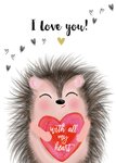 Verras jouw liefde met een super schattig liefdeskaartje. Dit egeltje is toch te lief?! Hij heeft een hartje vast met de tekst: "With all my heart." Sowieso vliegen de hartjes hem zichtbaar om de oren. "I love you!"