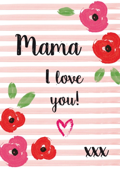 Tsjip heeft ook dit keer zichzelf weer overtroffen met deze schattige en hippe moederdagkaart. De kaart is versierd met bloemen en roze strepen. Op de kaart staat 'Mama I Love You'.