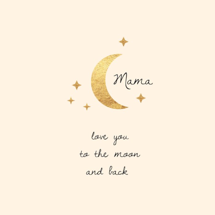 Deze moederdag kaart is voor de liefste moeders! Midden op de kaart staat een maan afgebeeld met een paar sterren erom heen. De kaart is afgemaakt met de teksten: "Mama" en "love you to the moon and back".