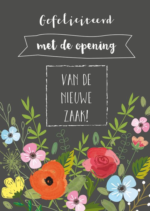 Ken jij iemand die een nieuwe zaak gaat openen? Deze mooie en hippe kaart van Tsjip is daar perfect voor. De kaart heeft een zwarte achtergrond. Met een mooie partij bloemen is de nieuwe zaak kaart afgewerkt.