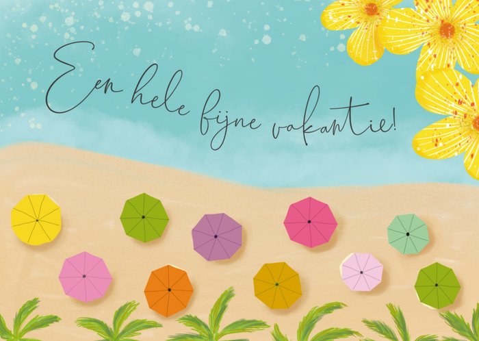 Wens de vakantiegangers een fijne vakantie met dit zomerse kaartje. Een strand met parasolletjes, heerlijk!