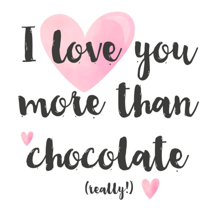 Een leuke witte valentijnskaart met een roze hart en de tekst 'I love you more than chocolate (really!)'.