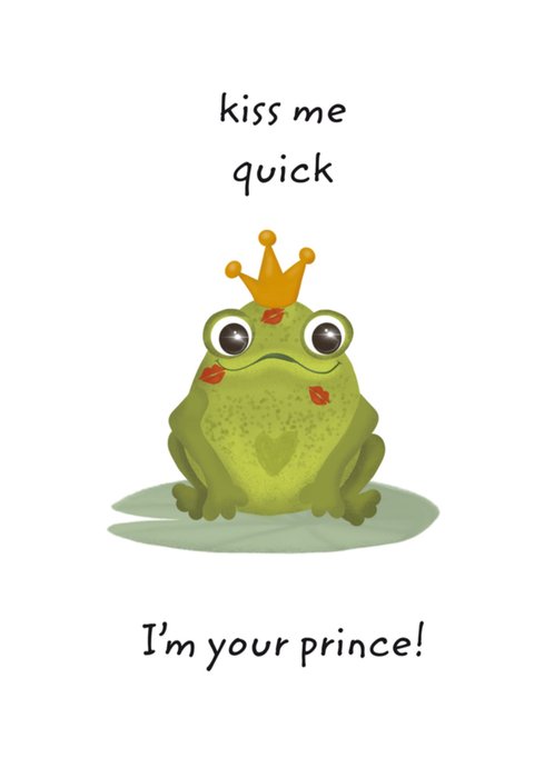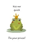 Illustratieve valentijnskaart met een kikker en de tekst: 'Kiss me quick. I'm your prince!'. Verras je liefde met deze leuke valentinskaart van Tsjip.