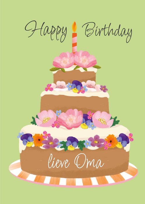 Illustratieve verjaardagskaart met illustraties van een taartspektakel en de aanpasbare tekst: 'Happy Birthday lieve Oma'. Verras je Oma met deze kleurrijke verjaardagskaart van Tsjip.