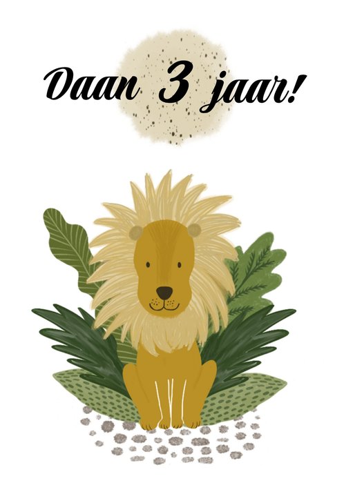 Verjaardagskaart met een leeuw op de kaart en de tekst: Daan 3 jaar. De naam en de leeftijd op de kaart zijn aanpasbaar.