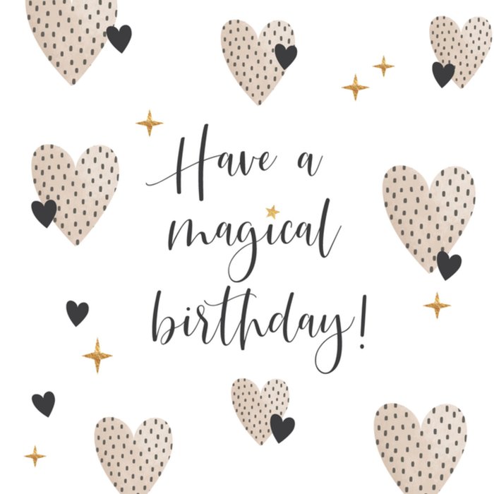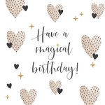 Wens iemand een fijne verjaardag met deze kaart. Deze leuke kaart heeft op de achtergrond hartjes en de tekst: "Have a magical birthday!."