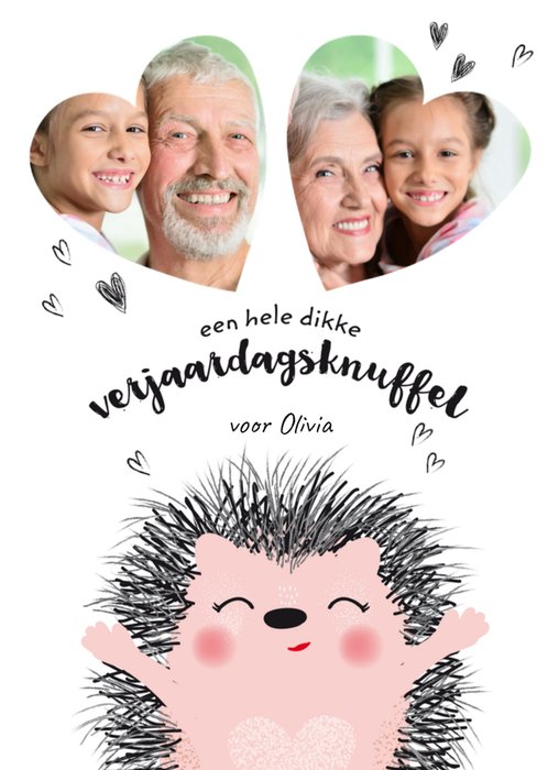Kleurrijke verjaardagskaart met illustraties van een schattige egel, hartjes, aanpasbare fotos en de tekst: 'Een hele dikke verjaardagsknuffel'. Verras de jarige met deze leuke verjaardagskaart van Tsjip.