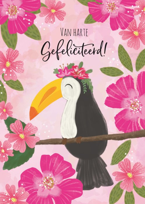 Wens iemand een fijne verjaardag met deze kaart. Op deze vrolijke kaart staat een toekan die wordt omringd door bloemen. Op de kaart staat de tekst: "Van harte gefeliciteerd!."
