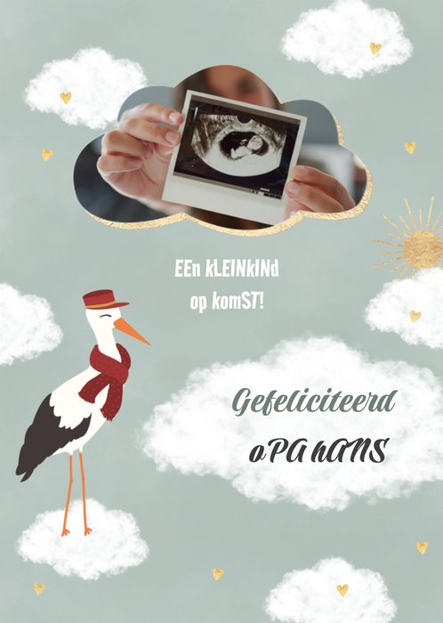 Lieve kaart met foto en aanpasbare naam met de tekst: Een kleinkind op komst! Gefeliciteerd opa [naam]