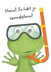 Leuke zwemdiploma kaart met kikker illustratie.