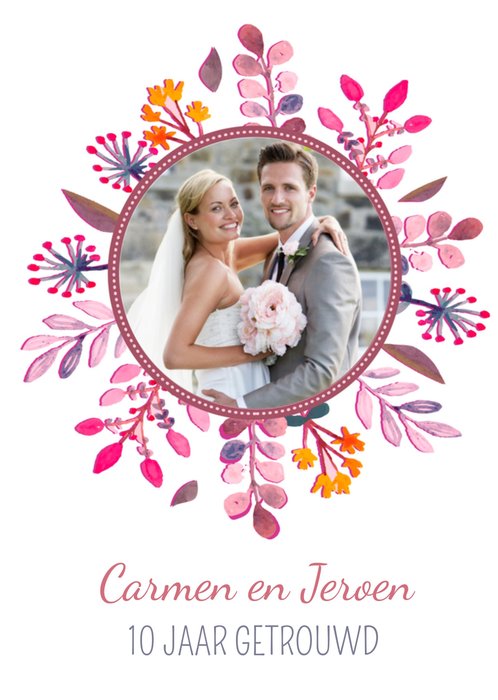 Van deze huwelijksjubileum uitnodiging word je spontaan vrolijk! Op de voorkant van de huwelijksjubileum uitnodiging kun je een foto plaatsen. De foto is versied met fleurige roze en oranje bloemen.