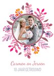 Van deze huwelijksjubileum uitnodiging word je spontaan vrolijk! Op de voorkant van de huwelijksjubileum uitnodiging kun je een foto plaatsen. De foto is versied met fleurige roze en oranje bloemen.