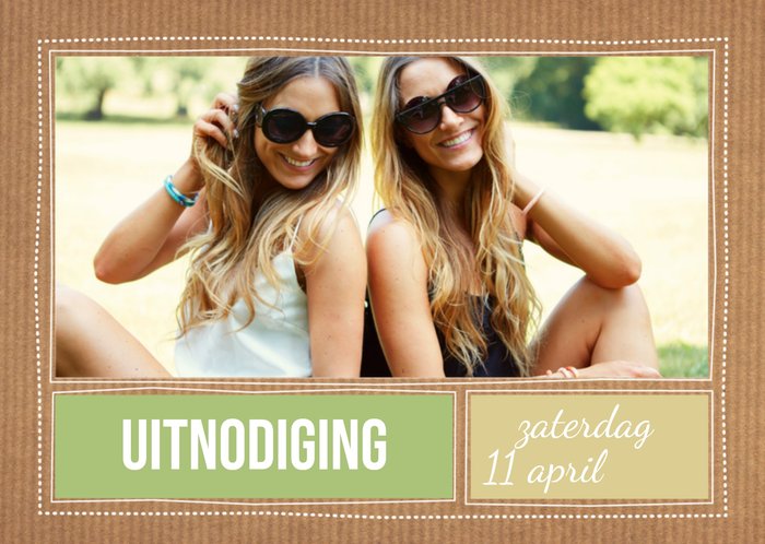 Bruine foto-uitndoging van Greetz met eigen datum en foto op de voorkant.