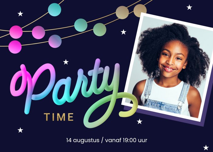 Wat leuk! Jij geeft binnenkort een feestje. Om je feestje nog leuker te maken, kun je deze uitnodigingen versturen van Luckz! Op de uitnodiging staat: Party time. Je kunt een foto en info neerzetten.