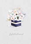 Mooie kleurrijke kaart waarop een cadeauverpakking staat met bloemen erin. Naast het cadeautje staat een glas champagne!