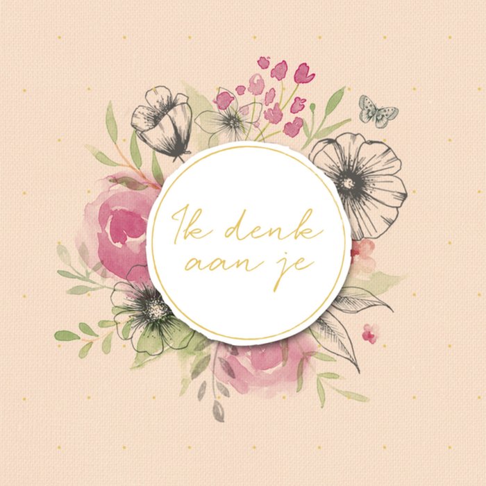 Mooie kaart met de tekst "Ik denk aan je" in het midden van de kaart. Om de tekst staan verschillende bloemsoorten en kleuren uitgebeeld.