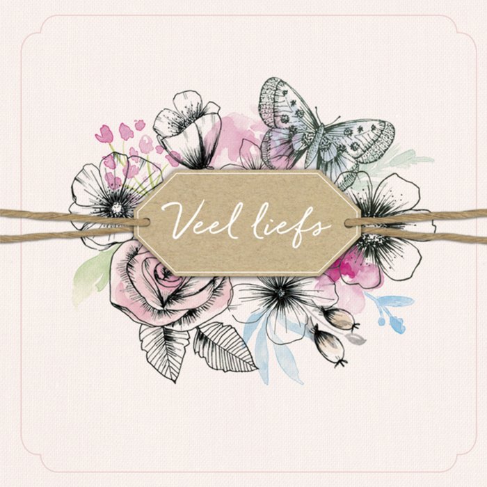 Prachtige kaart met bloemen en vlinders in verschillende kleuren. In het midden van de kaart staat de tekst "veel liefs"