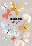 Denk je aan iemand? Laat het weten met een kaart. Deze kaart is versiert met vlinders en de tekst: thinking of you.