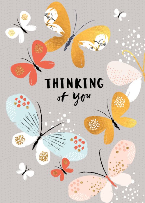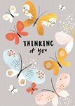 Denk je aan iemand? Laat het weten met een kaart. Deze kaart is versiert met vlinders en de tekst: thinking of you.