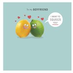 Grappige valentijnskaart met illustratie en de tekst: To my boyfriend I want to squeeze you!