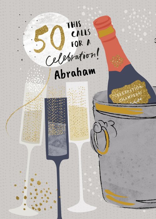 Mooie verjaardagskaart om een Abraham een fijne 50ste verjaardag mee te wensen met op de kaart de tekst: 50 this calls for a celebration! Abraham.