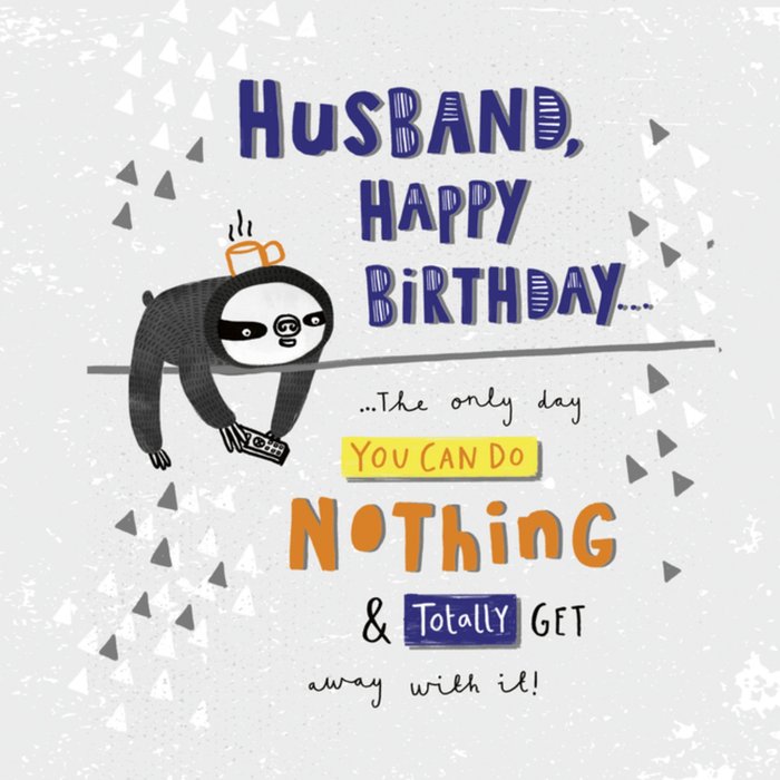 Leuke verjaardagskaart om je man een fijne verjaardag mee te wensen met de tekst: Husband, happy birthday. The one day you can do nothing & totally get away with it.