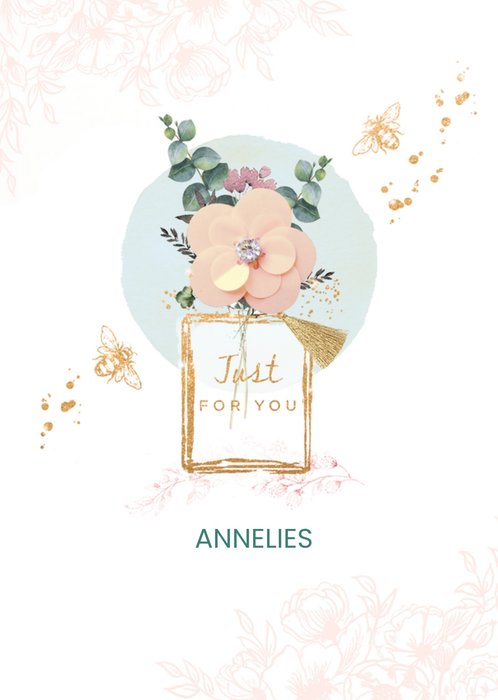 Fleurige verjaardagskaart met een parfumflesje met bloemen erop. Pas de naam aan en feliciteer de jarige extra persoonlijk.