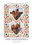 Illustratieve valentijnskaart met hartjes, aanpasbare fotos en de tekst: 'Twee zielen, één gedachte. Fijne valentijnsdag'. Verras iemand met deze kleurrijke en leuke valentijnskaart van V&A.
