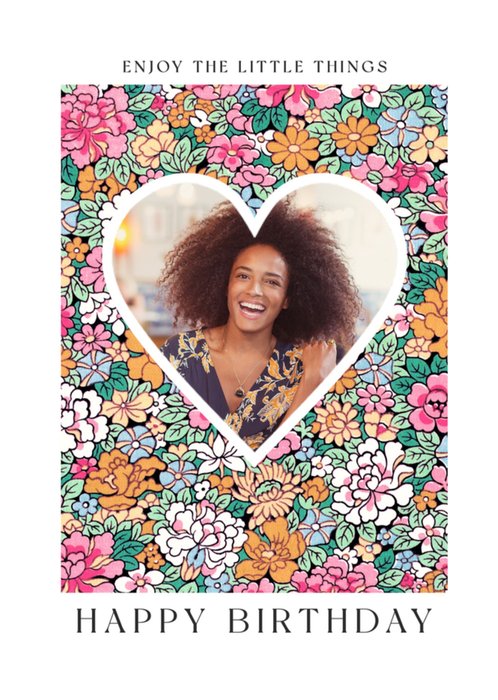 Kleurrijke verjaardagskaart met bloemen, aanpasbare foto en de tekst: 'Enjoy the little things. Happy Birthday'. Verras iemand met deze leuke verjaardagskaart van V&A.