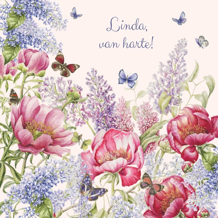 Vrolijke verjaardagskaart van Janneke Brinkman, met vlinders en bloemen. Op de voorkant kan een eigen naam worden toegevoegd.