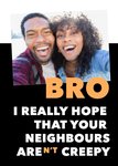 Jouw broer gaat een nieuwe en grote stap zetten, want! Hij gaat verhuizen. Stuur hem daarom een leuke verhuiskaart van Greetz! Op deze kaart staat: Bro, i really hope that your neighbours aren't creepy. Ook kun je een foto toevoegen.